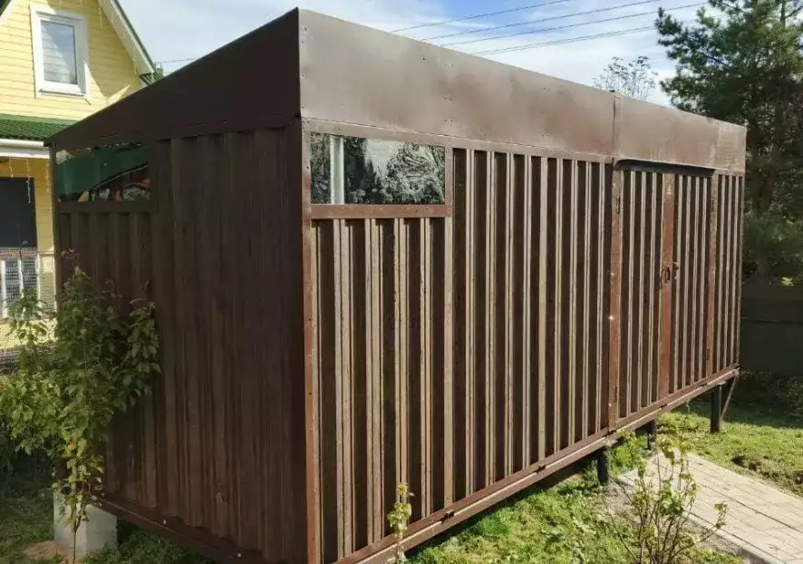 Так простой контейнер превращается в более практичную постройку. Односкатная или двускатная крыши не задерживают осадки, да и смотрятся повеселее. Односкатную можно прислонить вплотную к дому и…