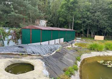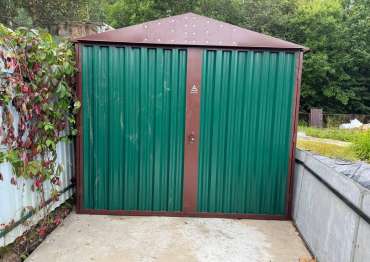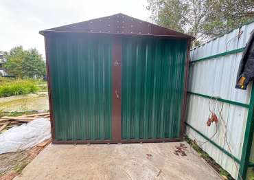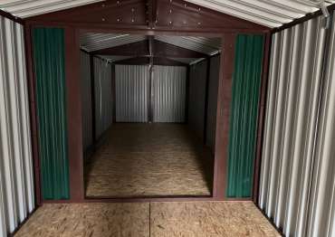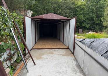 Нами была изготовлена конструкция размером 13 х 3 х 2,69 м с двускатной крышей и торцевой воротной группой в комбинации расцветок зеленого RAL 6005 для основных элементов и шоколадно-коричневого RAL 8017 для фасонных элементов и крыши.