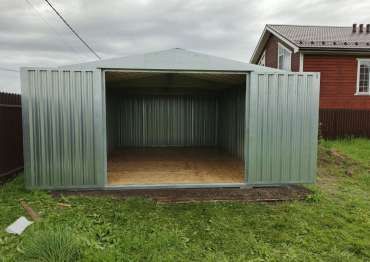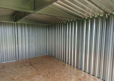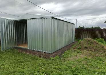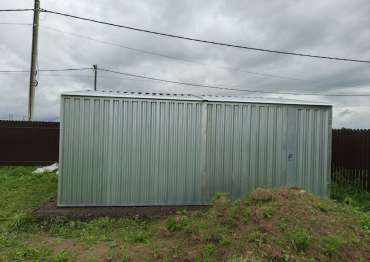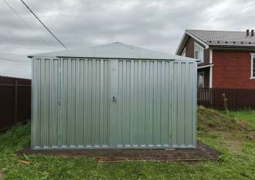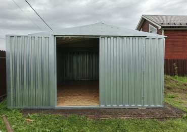 Нами была изготовлена широкая 6-метровая конструкция с увеличенной высотой 2,69 м с двускатной крышей и торцевой воротной группой в блестящем цинковом цвете.