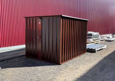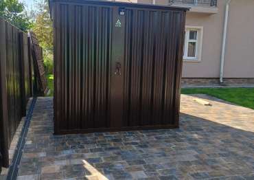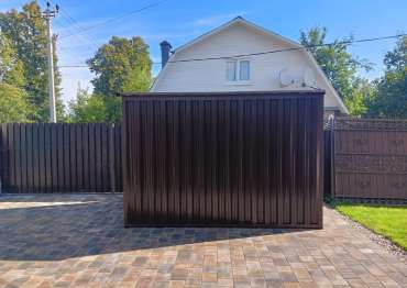 Нами была изготовлена стандартная 3-метровая конструкция с плоской крышей и торцевой воротной группой в популярнейшем шоколадно-коричневом цвете RAL 8017.