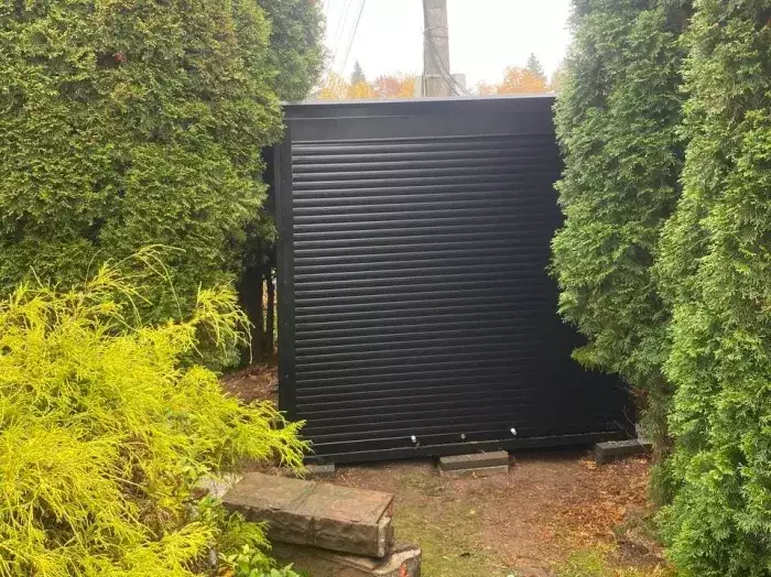 Нами была изготовлена конструкция размером 5,06 х 3 х 2,69 м с двускатной крышей и торцевой входной группой с рольставнями в комбинации цветов RAL 1015 «слоновая кость» для основных элементов и шоколадно-коричневого RAL 8017 для фасонных элементов и крыши. Именно такая расцветка была выбрана для того, чтобы строение гармонировало с жилым домом на участке.