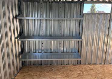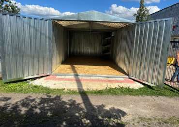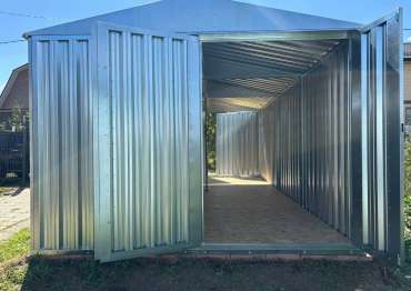 Нами была изготовлена конструкция размером 7 х 3,5 х 2,69 м с двускатной крышей и торцевой воротной группой в блестящем цинковом цвете.