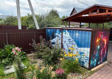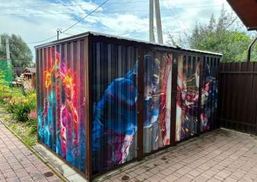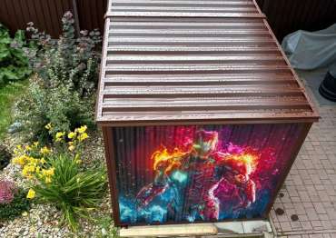 Нами была изготовлена стандартная 4-метровая конструкция с плоской крышей и боковой воротной группой. Все фасонные элементы, крыша и торцевая сторона постройки были выполнены в популярном шоколадно-коричневом цвете RAL 8017, а вот оставшиеся три стороны Алексей решил превратить в произведение искусства, нанеся на них красочный принт с изображением персонажей из фильма «Мстители». Мы с удовольствием поддержали такое решение нашего заказчика!