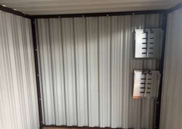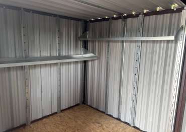 Дополнительно хозблок был оборудован двумя стеллажами с одной полкой глубиной 50 см и 30 см, антивандальным засовом, пандусами для удобного въезда техники, а также упорами для распашных ворот.