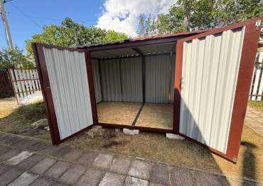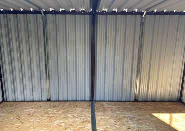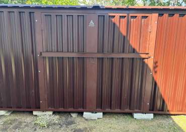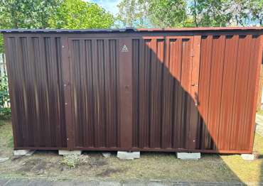 Нами была изготовлена стандартная 4-метровая конструкция с плоской крышей и боковой воротной группой в неизменно популярном шоколадно-коричневом цвете RAL 8017.