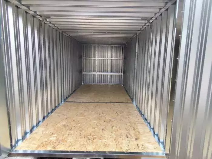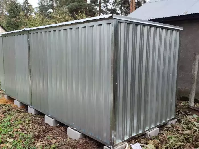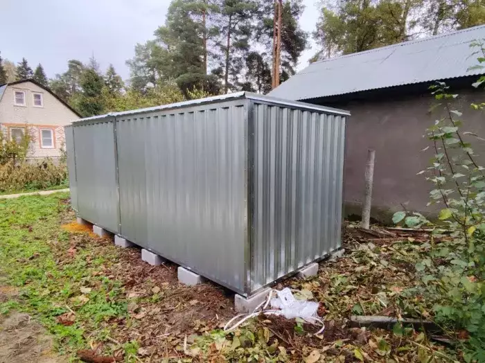 Дополнительно хозблок оборудован входной дверью с торцевой стороны, металлическим полом, прямым стеллажом, угловым стеллажом, а также тремя световыми окнами размером 90 х 30 см.