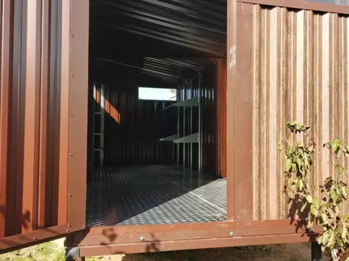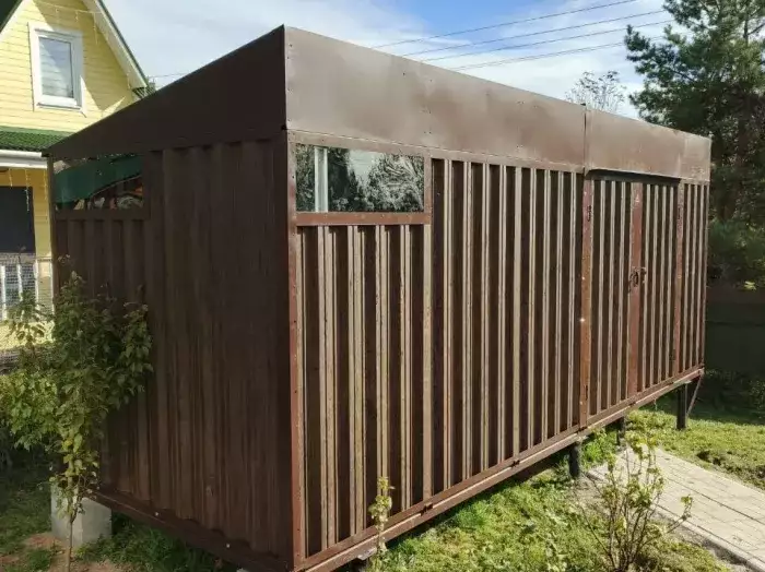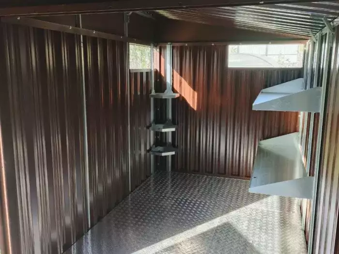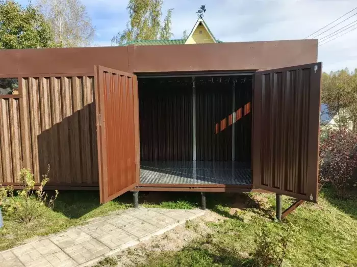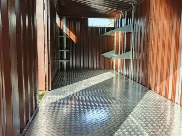 Дополнительно хозблок был оборудован металлическим полом толщиной 1,5 мм с чечевичным рифлением поверх плиты OSB, а также пандусами для комфортного въезда техники.