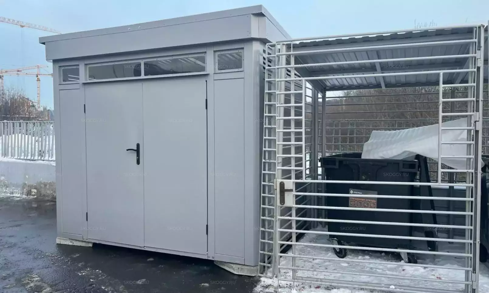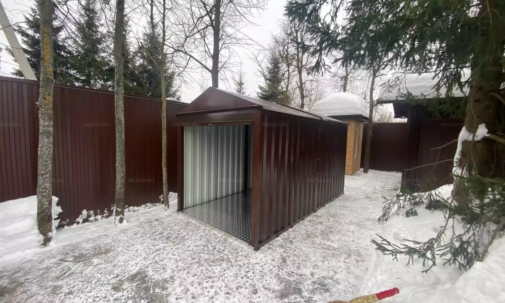Нами была изготовлена стандартная 5-метровая конструкция с односкатной крышей и боковой воротной группой в стильном графитовом цвете RAL 7024. Именно этот цвет был выбран для того, чтобы хозблок гармонировал по цвету с забором на участке заказчика.