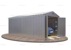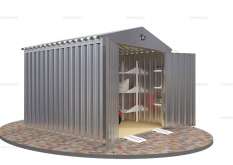 Если же вы решили сделать забор из профнастила, то придется выровнять под него землю. Но, благодаря этому, забор не только надежно защитит вашу территорию и будет долго служить, но и хорошо будет сочетаться с садовым хозблоком. Если вы сделаете выбор в пользу легковозводимых контейнеров СКОГГИ, то можно будет подобрать его окрас под тон ограждения в палитре RAL. Кроме того, вы сможете заказать принт под лес, траву, листву или камень и спрятать металлический хозблок среди деревьев или сделать его гармонично сочетающимся с цветом кладки вашего дома.